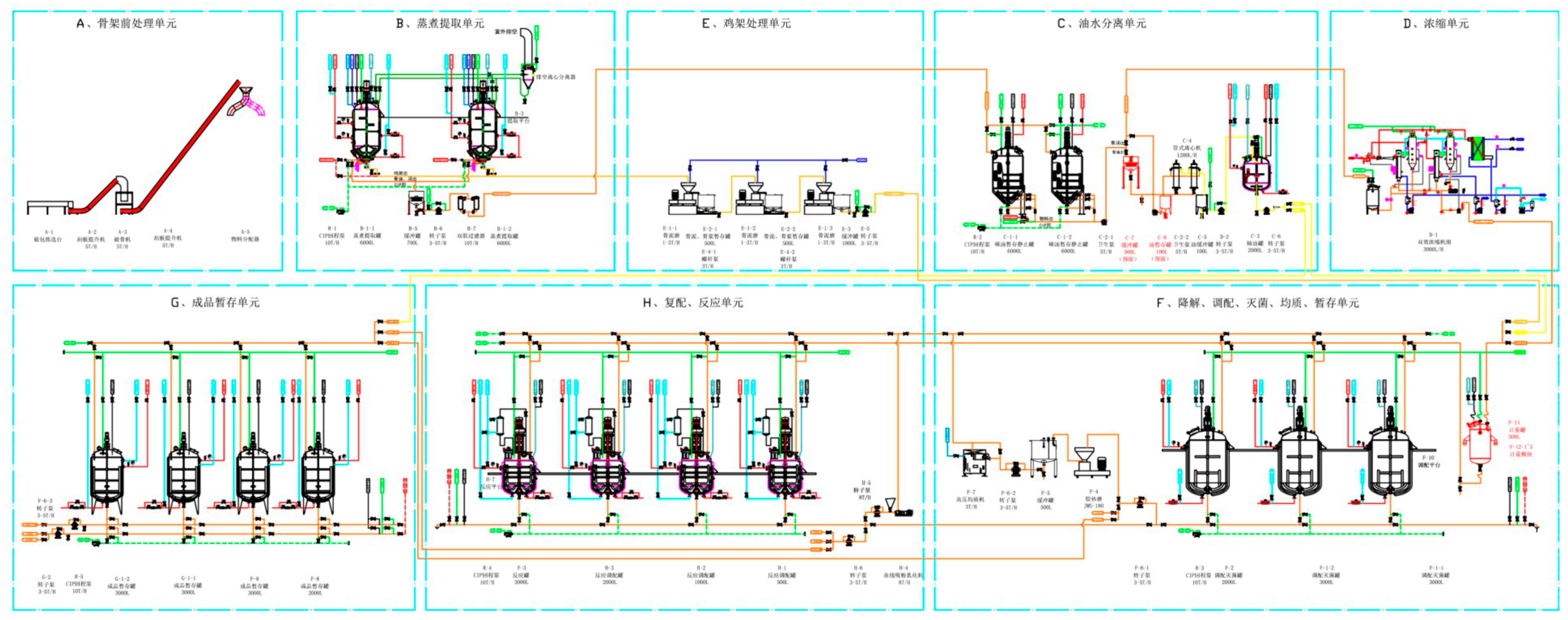 原料骨破碎系统、提取罐系统、水回收系统、汤液分离罐系统、浓缩系统、调配灭菌系统、美拉德反应罐系统、成品暂存系统、灌装系统、残骨系统、电控系统等组成。