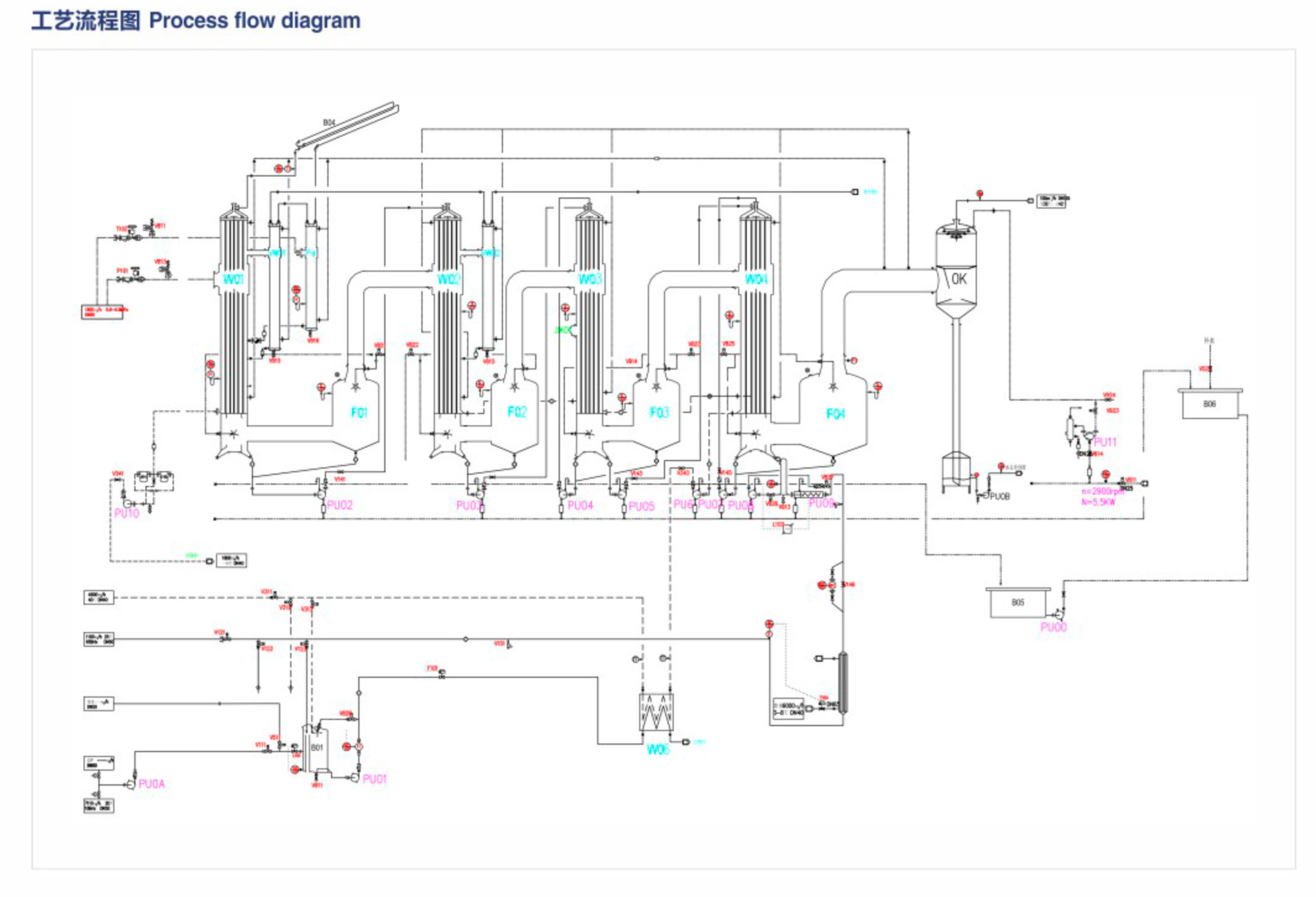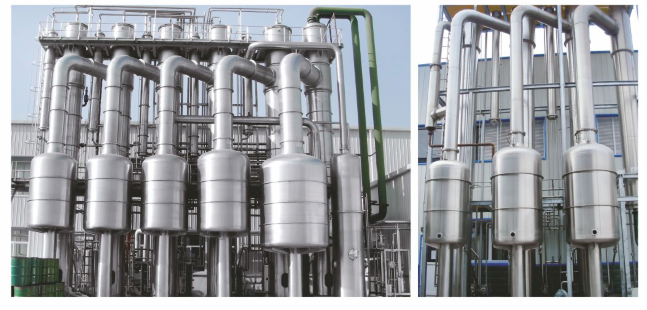 ◎适用于发泡性物料蒸发浓缩,由于料液在加热管内成膜状蒸发,即形成汽液分离,同时在效体底部,料液大部份即被抽走,只有少部分料液与所有二次蒸汽进入分离器强化分离,料液整过程没有形成太大冲击,避免了泡沫的形成;