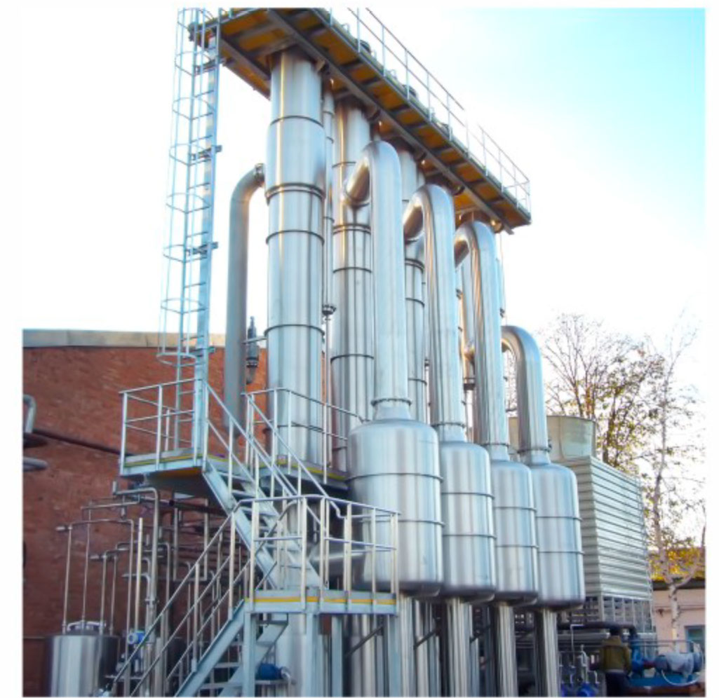 蒸发器、分离器、冷凝器、热压泵、真空泵、料液泵、冷凝水泵、操作平台、电气仪表及阀门管路等系统组成。